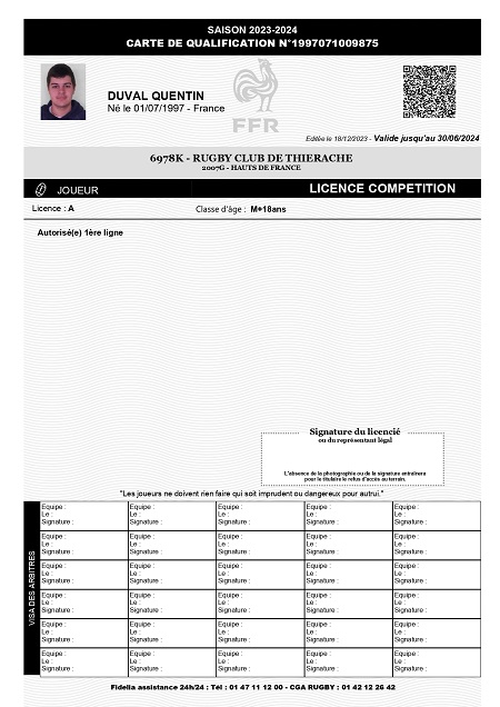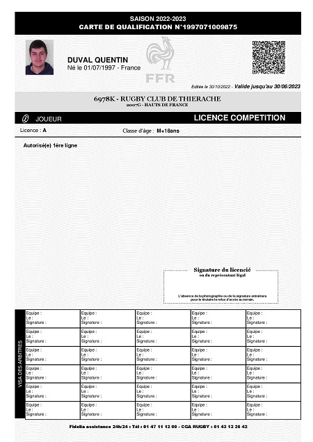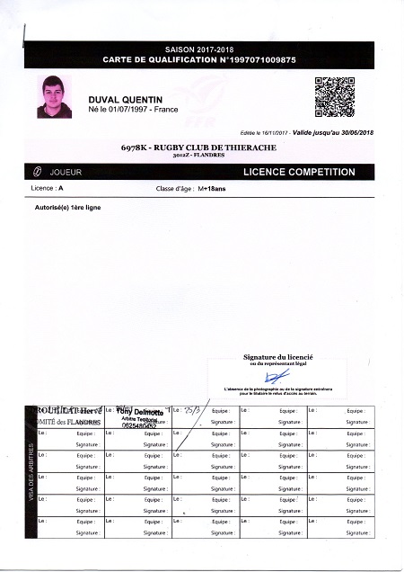 Nom:   Duval Prénom:   Quentin Date de naissance:   Mardi 01 juillet 1997 Lieu de naissance:   Hirson (France) |
